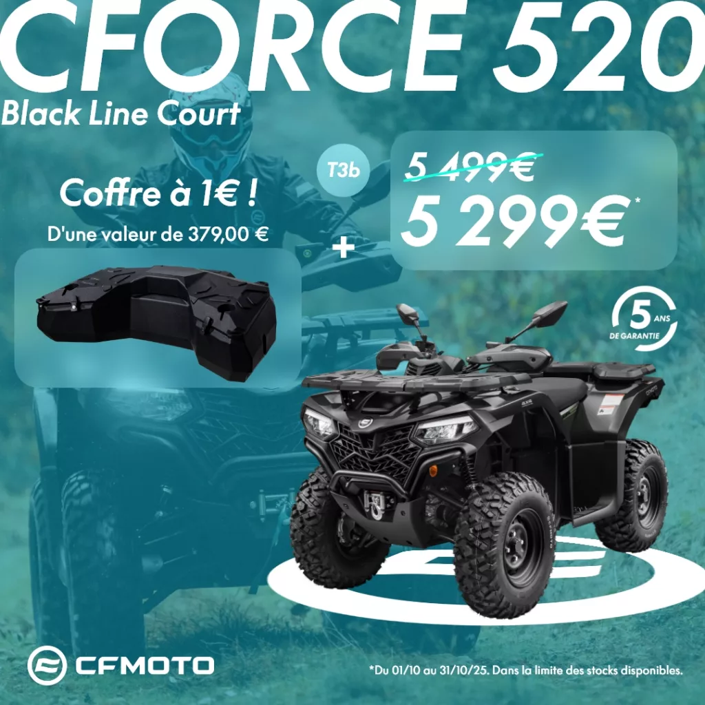 Le CFORCE 520 Black Line Court passe à 5 299 € au lieu de 5 499 €. Soit 200 € de remise, et pour 1 € de plus, le coffre arrière AG COFFRE X10 est offert.
